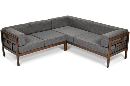 - Модулен дървен градински ъглов диван с 5 места. Кафяв ъглов диван с бежови възглавници, изработен от дърво, намазано с екологичен лак. Здрав градински ъглов диван, за терасата, градината или големия балкон. Устойчив на вода, мухъл и гъбички.