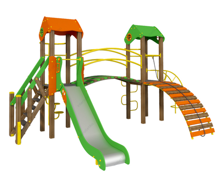 Комплектът за игра"Gnomik-NEW" T802 NEW е модерен развлекателен комплекс за деца, предназначен за физически упражнения и забавление заедно на открито. Конструкцията се състои от платформи, монтирани на стойки, свързани с мостове и разнообразени с допълнителни елементи, които осигуряват разнообразни дейности.