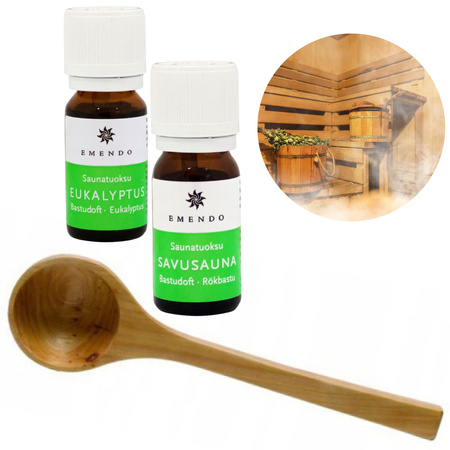 Sada příslušenství Emendo je ideálním řešením pro každého milovníka saunování. Sada obsahuje ergonomickou dřevěnou naběračku o délce 37 cm, která je ideální pro volné dávkování olejů. Eukalyptový olej má navíc antiseptické a stimulační účinky, zatímco kouřový saunový olej vnáší do sauny jedinečnou hřejivou vůni, která vás přenese do kouzelného světa sauny. Díky přírodním složkám se každé sezení stane nejen potěšením, ale také blahodárným zážitkem pro vaše zdraví.