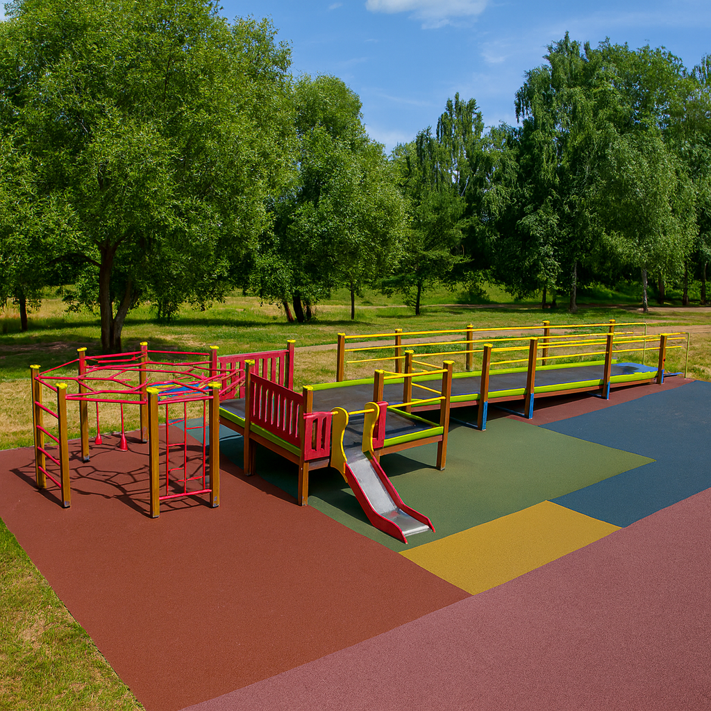 Legeplads T601 — rekreativt kompleks med rampe, gelændere og rutsjebane (EN 1176) til børn