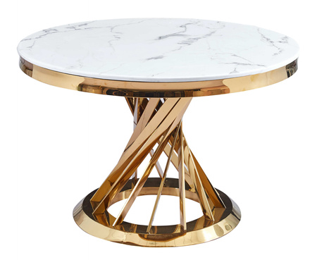 Et elegant og moderne bord, der bliver centrum i din spisestue. Fremstillet af poleret rustfrit stål i guld, kombinerer det holdbarhed med et luksuriøst udseende. Bordpladen i hvid marmor tilføjer klasse og subtil elegance. Perfekt til moderne interiører, hvor stil og kvalitet tæller.
