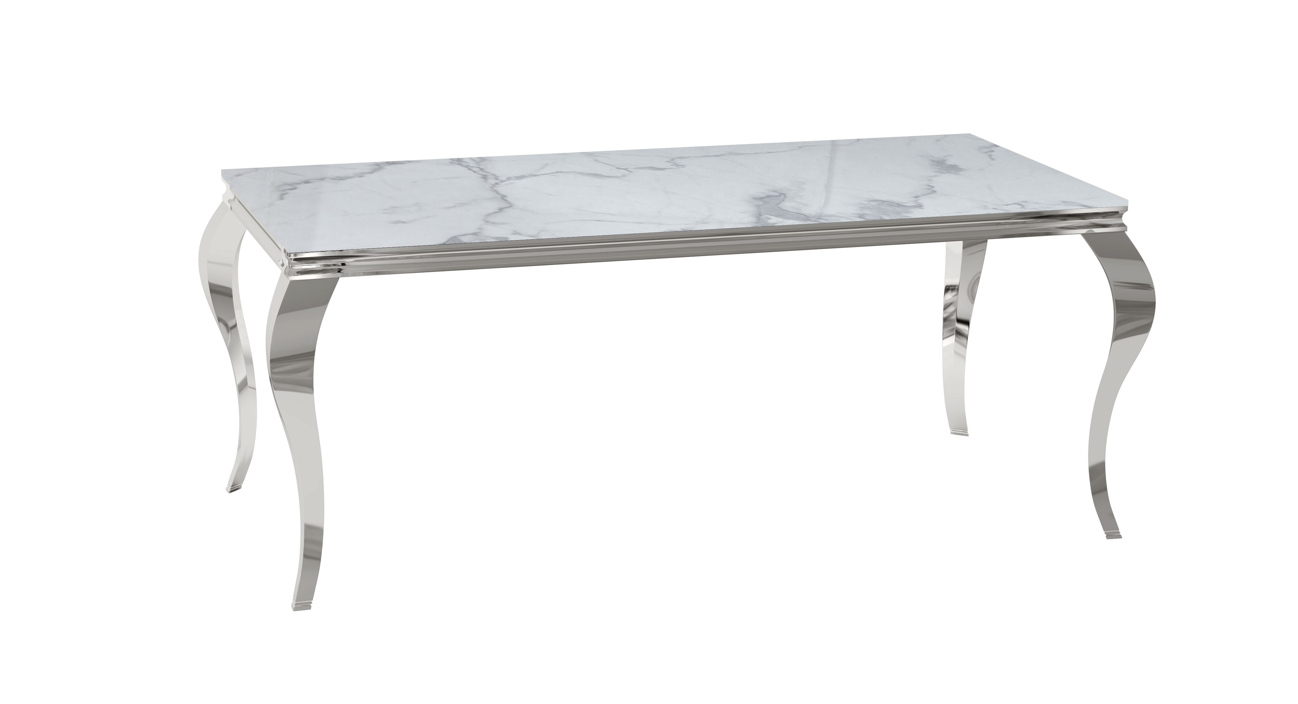 Spisebord VALENTINO med Hvid Marmor Bordplade og Sølv Base – Luksus til din Spisestue