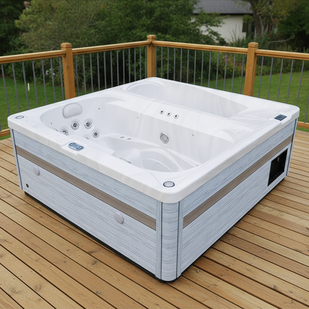 2180 × 2180 × 820 mmHybrides Warm- & Kaltwasser-Spa mit einer Wanne aus US-Acryl auf einem Rahmen aus Aluminiumlegierung. Steuerung über Balboa BP200G2 + TP500S mit 3 kW Heizung und Wi-Fi Kaltwasser-Chiller. Pumpenset: 1 × 1 HP Chiller, 1 × 3 HP Jetpumpe und eine 0,35 HP Umwälzpumpe.