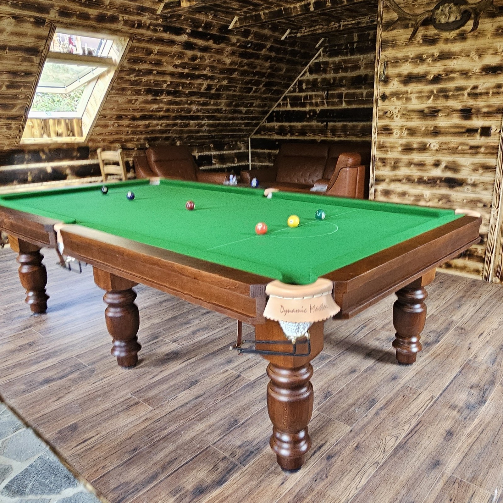Τα τραπέζια μπιλιάρδου μας δεν είναι μόνο λειτουργικά και σχεδιασμένα για μπιλιάρδο, αλλά μπορούν επίσης να χρησιμεύσουν ως μια όμορφη διακόσμηση σαλονιού. Αυτό είναι όλο χάρη στη μοναδικά περίτεχνη βάση, η οποία τραβάει την προσοχή και προσθέτει έναν μοναδικό χαρακτήρα. Κατασκευασμένο από μασίφ ξύλο, η κατασκευή είναι σταθερή και ανθεκτική. Η επιφάνεια του τραπεζιού είναι καλυμμένη με φυσικό καπλαμά - τα ορατά νερά προσδίδουν σε όλο το έπιπλο μια πολύ ελκυστική εμφάνιση. Αυτό το έπιπλο αποτελεί την ιδανική βάση για τη δημιουργία κομψών συνθέσεων.