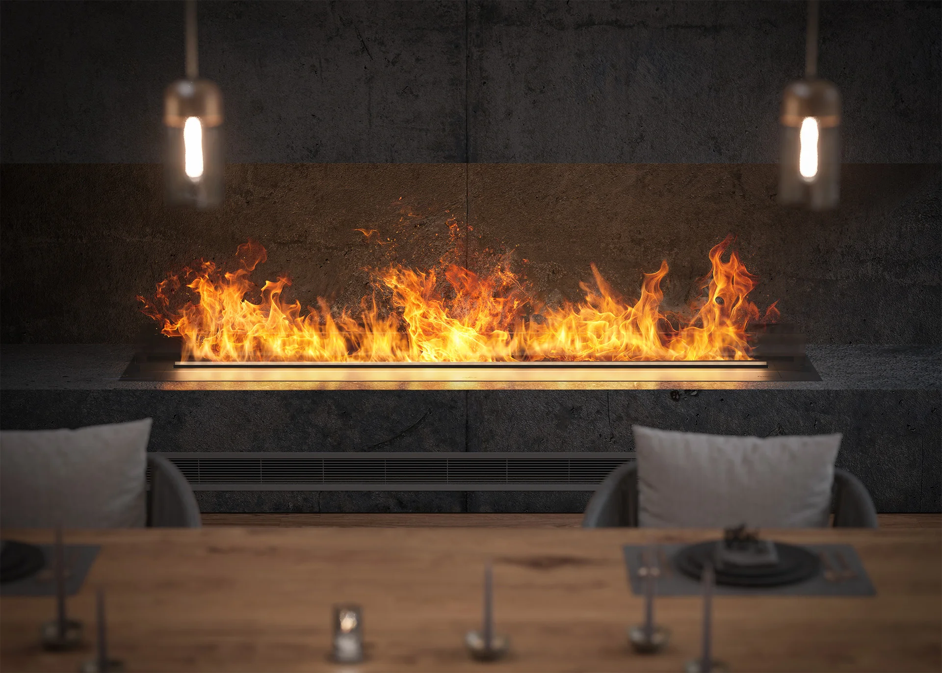 This device is designed for large interiors, decorative niches, accent walls — anywhere the fireplace is intended to become the main element of the arrangement.