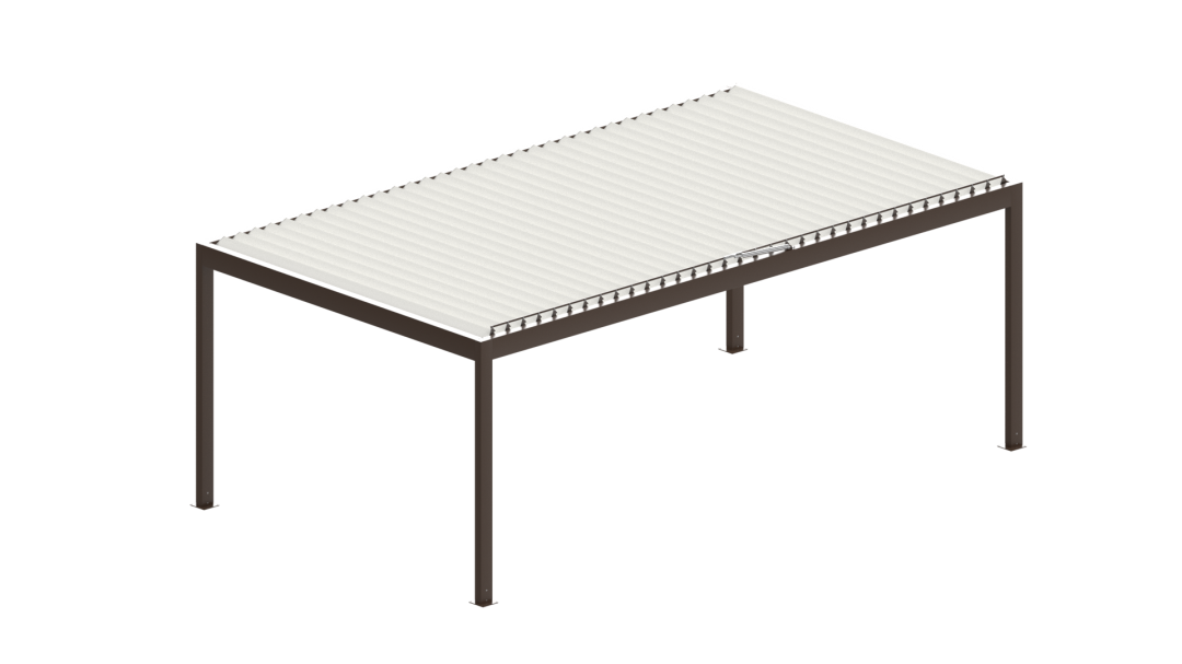 Elektromosan vezérelt tetőburkolat, amely lehetővé teszi az alumíniumtollak dőlésszögének fokozatmentes beállítását az optimális árnyékolás és az eső elleni védelem érdekében.