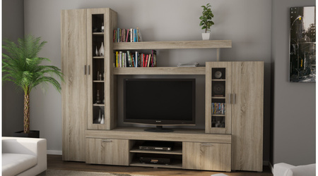 Apollo sieninė spinta - tai tarpusavyje derantis baldų komplektas. Jie pagaminti iš aukščiausios kokybės baldinių plokščių, kurios yra atsparios įbrėžimams ar drėgmei. Jų kraštai padengti atsparia PVC briaunų juosta. Visą komplektą sudaro keli elementai: RTV spintelė, lentynos, vitrina ir spintelės.