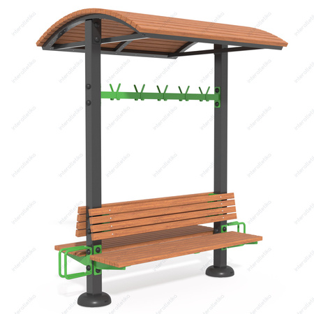 - Tai iki smulkmenų apgalvotas suoliukas su stogeliu ir dviračių stovėjimo vieta. Konstrukciją sudaro dvi tvirtos atramos su stogeliu viršuje, du patogūs suolai su atlošais, vienas dviračių laikiklis, pastatytas tarp suolų.