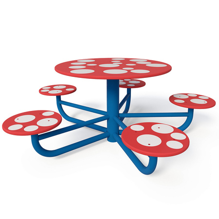 TE313 "Toadstool" - tai vaikiškas žaidimų stalas su penkiomis apvaliomis sėdynėmis. Rinkinys puikiai tinka nedidelei vaikų grupei stalo žaidimams, piešimui ar komandos formavimo užsiėmimams. Ryškios spalvos traukia akį ir natūraliai įsilieja į žaidimų aikštelės, darželio sodo ar poilsio zonos kraštovaizdį.