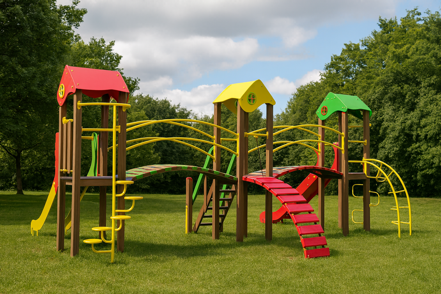 Speeltoestel „Karapuz-NEW” T803 NEW is een innovatief recreatiecomplex, ontworpen voor kinderen van 3 tot 12 jaar. De constructie bestaat uit drie torens die met bruggen zijn verbonden, en extra elementen zoals schelpen maken het spelen nog leuker en leerzamer.