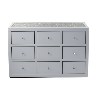 - Piękna, nowoczesna komoda zdobiona kryształkami. Wykonana z białego szkła, oferuje dziewięć szuflad na praktyczne przechowywanie. Idealna do salonu, sypialni lub eleganckiego holu.
