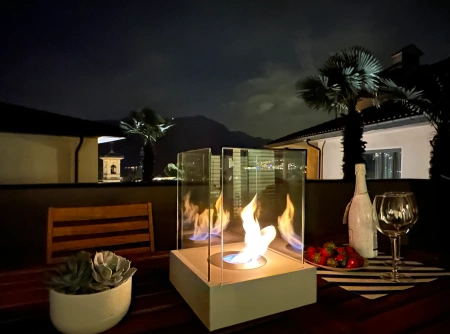 Sunset Garden Mini samostoječi kamin na bioetanol v beli mat barvi - kompakten kamin na bioetanol brez dima za majhne interierje in balkone